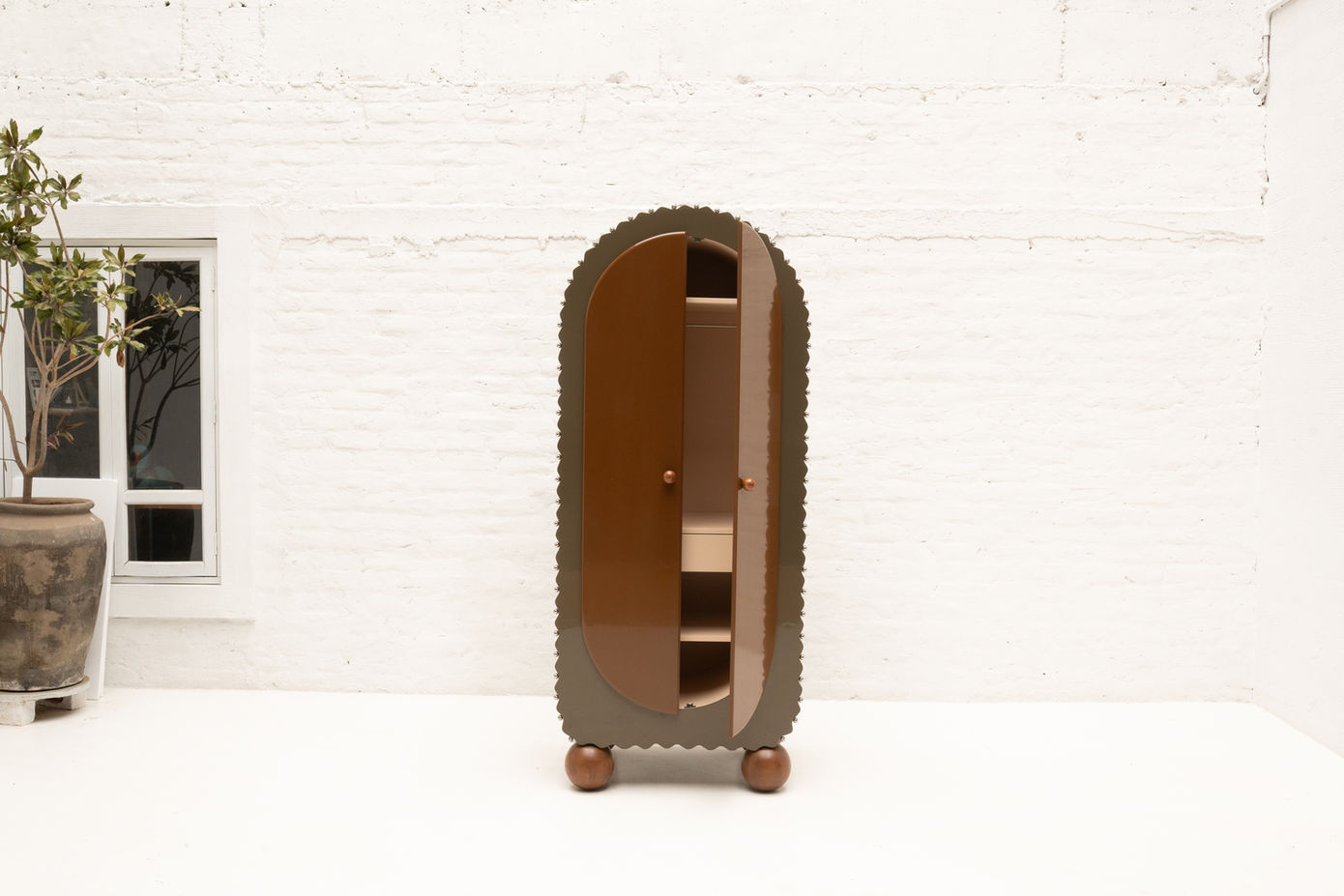 This striking storage unit, crafted from upcycled corrugated steel, combines bold design with eco-conscious materials. Its smooth curves and ornamental metal spheres serve as both structural elements and artistic accents, enhancing its organic aesthetic. Customizable in color and metal spheres, it offers versatility for any interior style, making it a standout piece in any space.