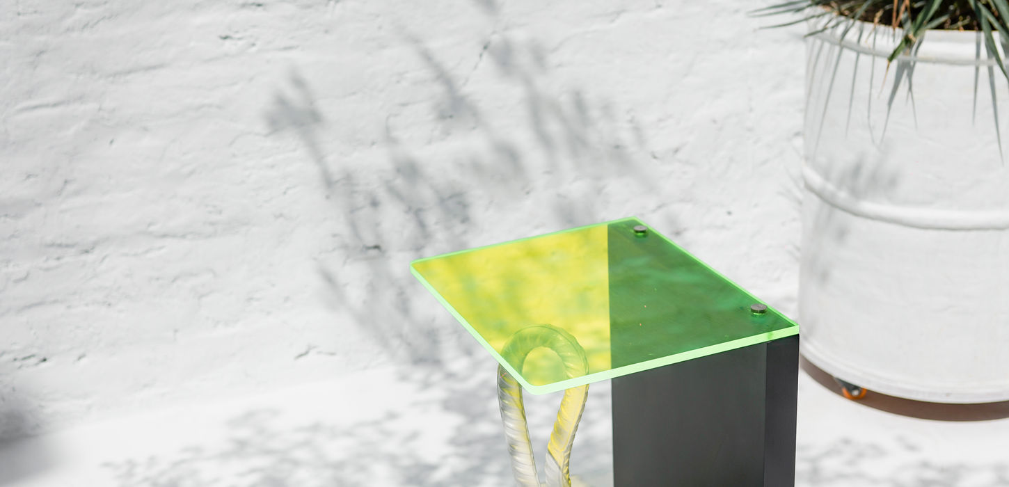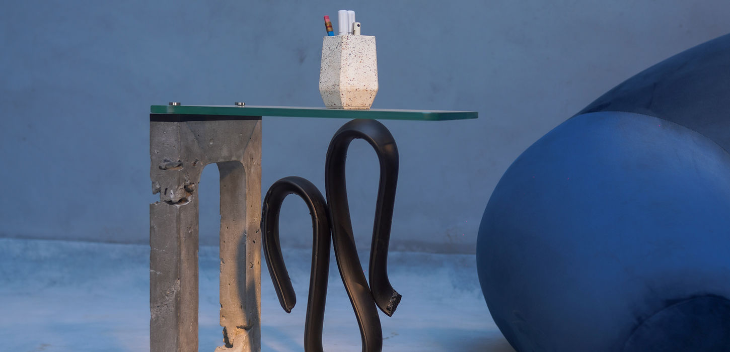The Sketchy Table is where raw nature meets contemporary form. A solid wood slab top, marked by natural cracks, rests on slender steel rods in an organic, sketch-like flow. Neon accents bring a vibrant edge, while the concrete base grounds the design with strength and stability.